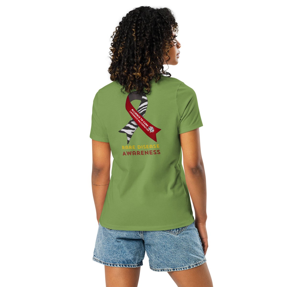 This shirt has an Alliance to Cure logo on the front and a Rare Disease day ribbon on the back.
